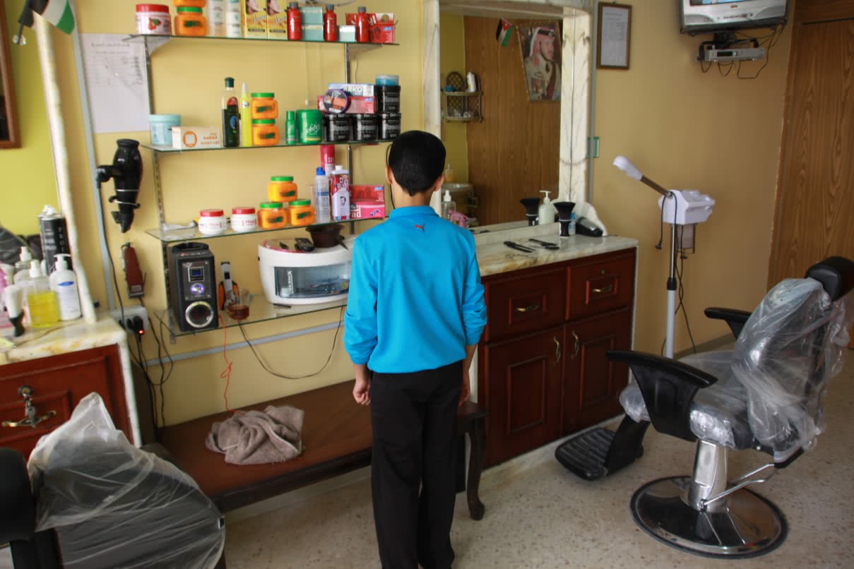 Alaa* is 12 years old. He fled to the North of Jordan half a year ago. To help his family make ends meet both he and his 13-year-old brother have to work. He starts his job in a barber shop at 9am and works until 10.30pm at night. He sweeps the floor and cleans the scissors. He earns around $7 per week. He says that he sometimes gets very dizzy when he has to stand all day, but his family cannot afford more than one or two meals every day. (Photo: CARE/Johanna Mitscherlich)